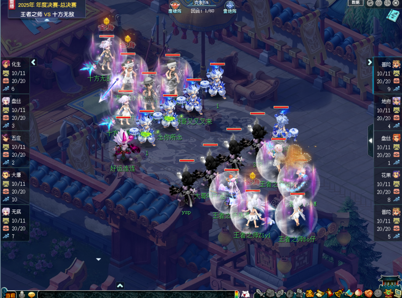 终于,一直处于防守状态的【十方无敌】在58回合露出破绽,在面对【王者之师】的最后一波谛听攻势时,【十方无敌】的化生被成功击杀。五庄、无底和化生先后倒地让【十方无敌】无法继续应对【王者之师】的猛烈进攻,输掉了这场比赛。