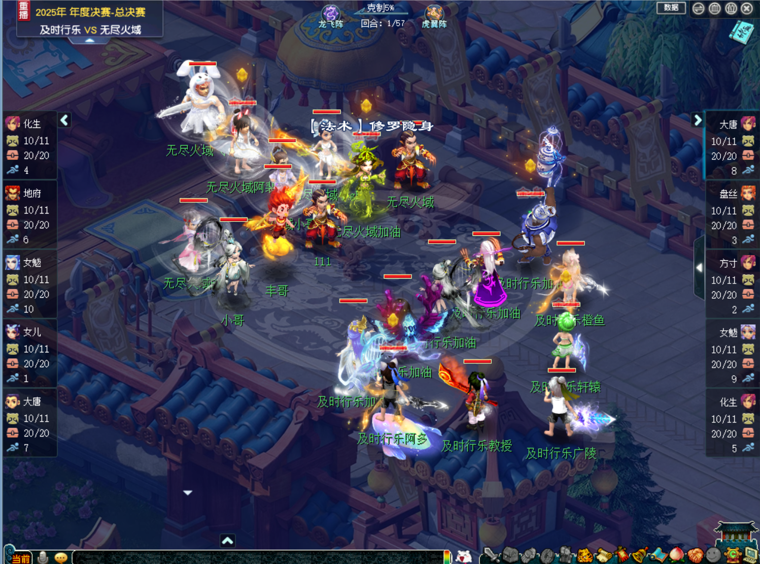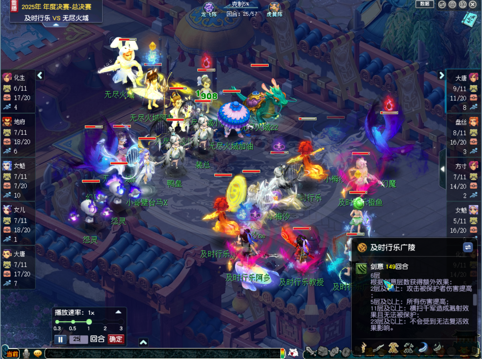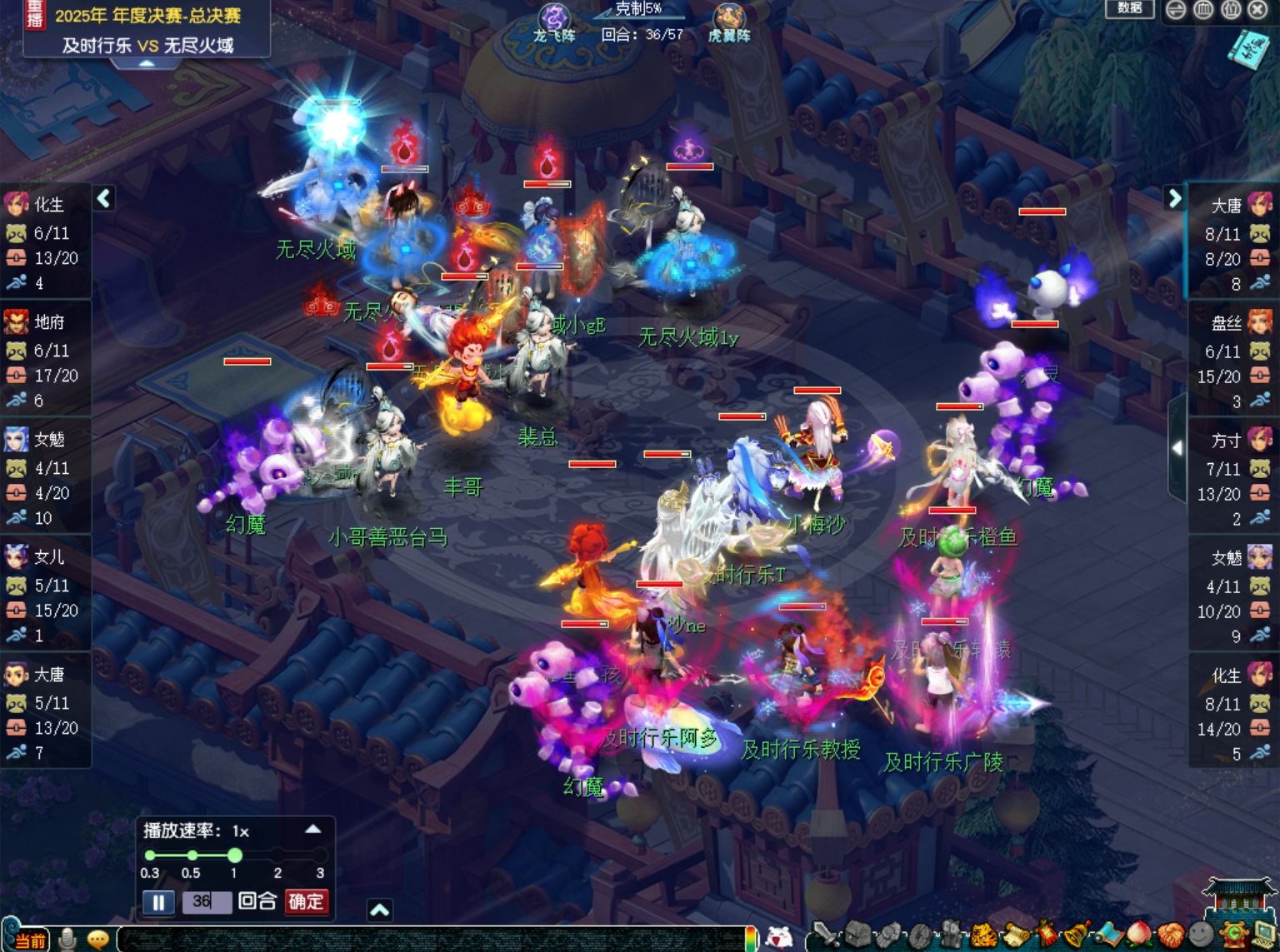 比赛进行至36回合时,【及时行乐】的三刀大唐叠出11层剑意开始转守为攻。由于【及时行乐】前期以清宠和清幻魔为主,这时候,【及时行乐】场上的幻魔和整个队伍的宝宝储备都处于优势。