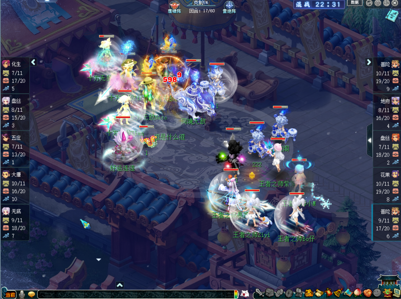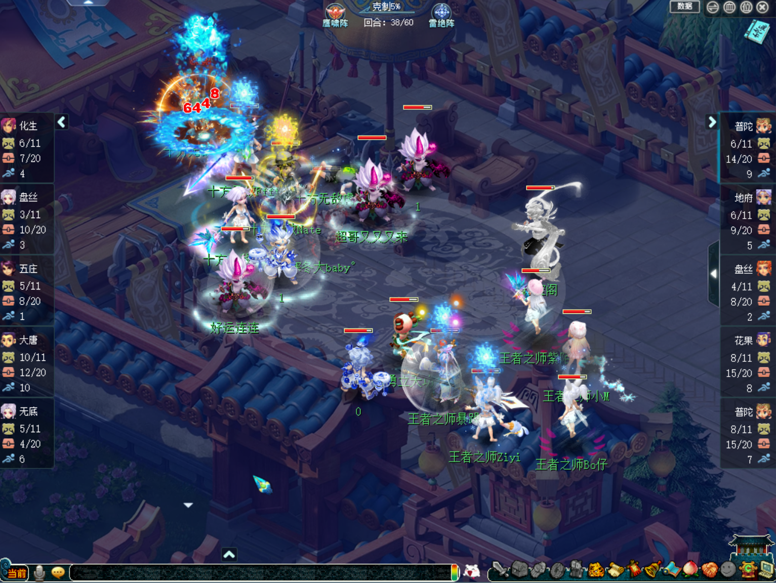 比赛进行至中期36回合,【十方无敌】的大唐叠出了11层剑意,并利用风林火山提速,成功加持天地同寿准备转守为攻。不过,由于【王者之师】在比赛前期打的相对谨慎,此时,他们还有着较多的战斗资源。为了继续压制【十方无敌】大唐的输出节奏,【王者之师】开启了连续的谛听攻势。
