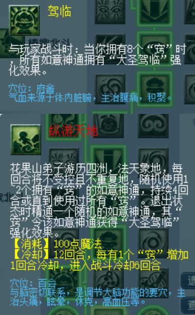 大家可以通过经脉技能“驾临”或经脉大招“纵游天地”让“窍”达到“精通”状态。此时,咱们的如意神通将被赋予大圣驾临的强化效果。