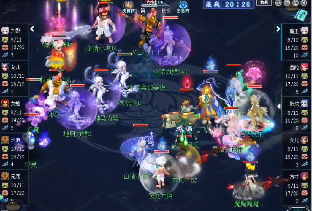 第八回合,劝你善良战队试图点杀东风狮驼,东风5C方寸则使用一记宁心道符抵消了锢魂术,虽然狮驼岭被劝你善良触发奇袭的九黎击倒,但是下回合拉起依旧可以保证连贯的输出,劝你善良此时多人残血,局势非常不利,必须放手一搏了。